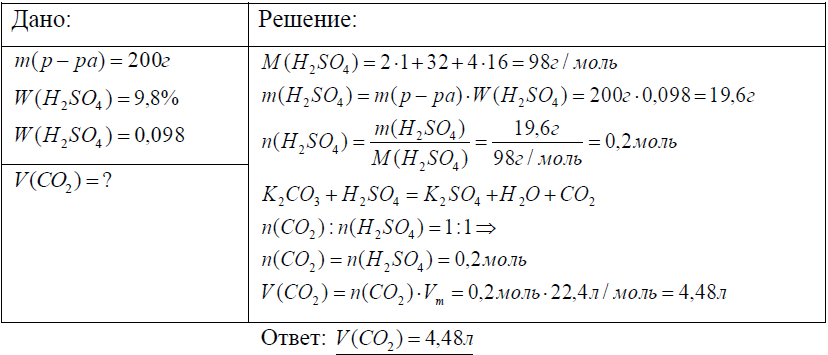 12С. Определите объем (н.у.) газа, образовавшегося в результате реакции между 200 г 9,8%-го раствора серной кислоты и избытком раствора карбоната калия.