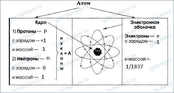 1) Ядро атома содержит протоны и нейтроны, суммарная масса которых равна массовому числу атома.