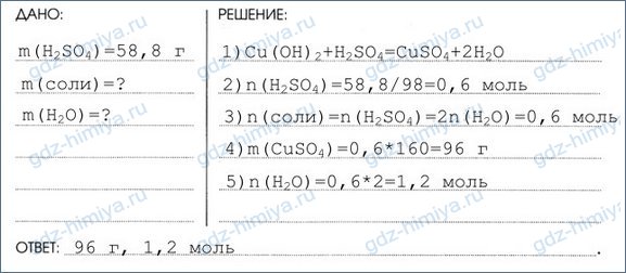 5. Определите массу соли и количество вещества воды, полученных при взаимодействии гидроксида меди (II) с 58,8 г серной кислоты.