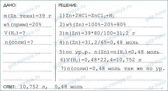 5. 39 г технического цинка, содержащего 20% примесей, растворили в избытке соляной кислоты. Найдите объём полученного водорода (н. у.) и количество вещества соли.