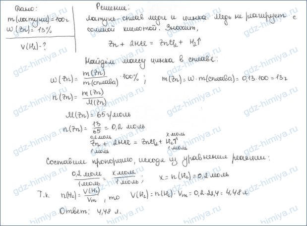 4. Вычислите объем водорода (н.у.), который образуется при растворении 100 г латуни, содержащей 13% цинка, в соляной кислоте.