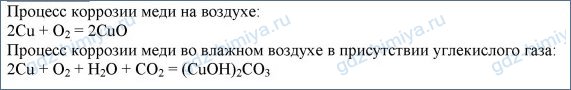 1. Медь на воздухе покрывается тонким слоем оксида, придающим ей темную окраску, но во влажном воздухе и в присутствии углекислого газа на ее поверхности образуются соединения зеленого цвета ((CuOH)2СO3). Напишите уравнения реакций коррозии меди.