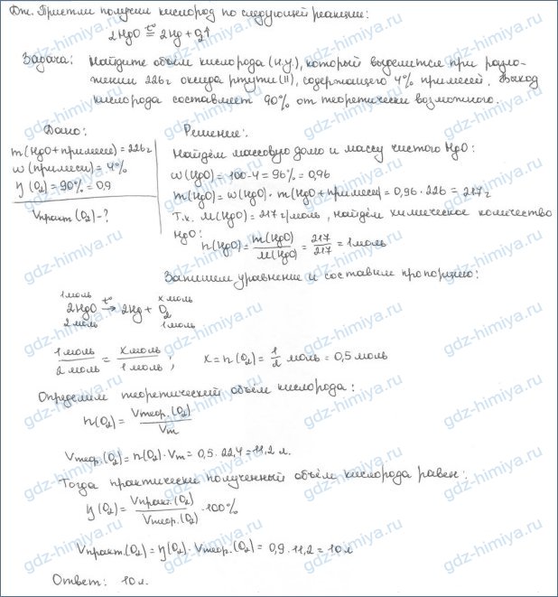 4. Английский химик Дж. Пристли получил кислород разложением оксида ртути (II). Напишите уравнение этой реакции. Придумайте и решите задачу, в условии которой были бы указаны масса исходного вещества и доля в нем примесей, а требовалось бы найти объем кислорода при известном выходе его от теоретически возможного.
