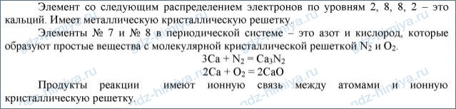 4. Напишите уравнения реакций между простым веществом, образованным химическим элементом, в атоме которого электроны распределены по энергетическим уровням согласно ряду чисел: 2, 8, 8, 2, и простыми веществами, образованными элементами № 7 и № 8 в Периодической системе. Каков тип химической связи в продуктах реакции? Какое кристаллическое строение имеют исходные простые вещества и продукты их взаимодействия?
