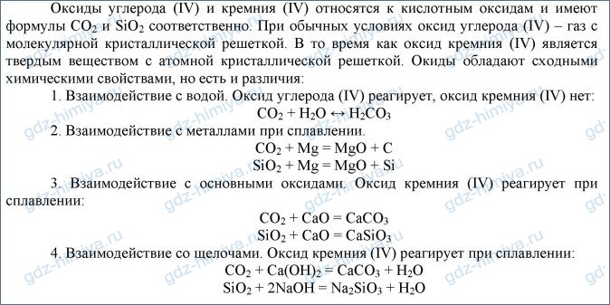 1. Укажите сходство и различие оксида углерода (IV) и оксида кремния (IV) по строению и свойствам. Напишите уравнения реакций.