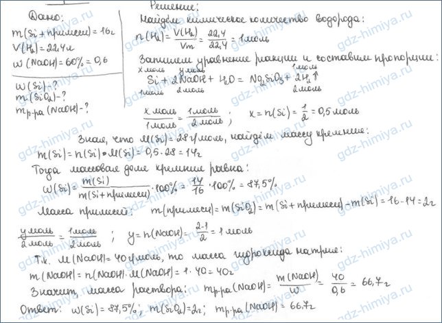 3. При взаимодействии избытка раствора гидроксида натрия с 16 г кремния было получено 22,4 л водорода (н.у.). Вычислите массовую долю кремния во взятом образце. Сколько граммов оксида кремния (IV) содержалось в нем? Сколько граммов 60% -го раствора щелочи потребовалось для реакции?